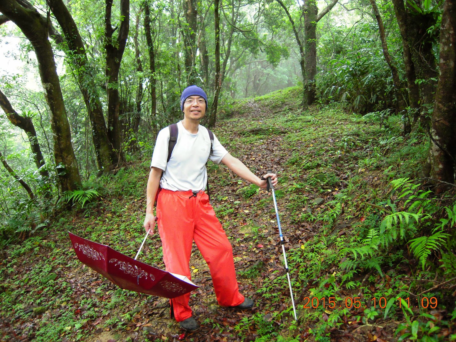 1143 叉路取直(315122,2725816),右為獵徑,好奇的走進去看,沒想到裡面陷阱器材之多,令人驚訝,不想再看,回頭取直走,沒想到再度遇到兩人一組的獵人,打聲招呼便離開,他們應該正在佈陷阱吧!回造林路登山口時,發現這兩個獵人佈了很多捉食蛇龜的老鼠籠。